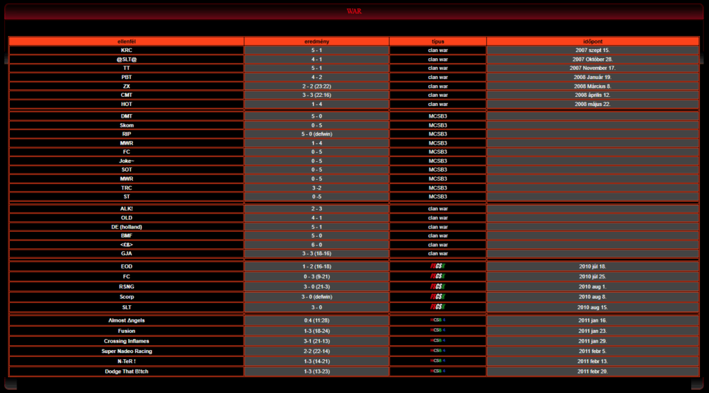A klánon belüli bajnokságok, illetve a klánok közötti összecsapások sem voltak ritkák. A „Wolf Clan” nevű csapat „war” naptára a mai napig elérhető:
