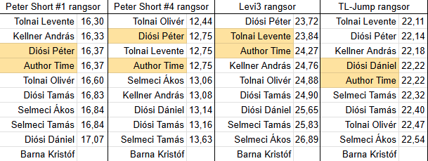 A Peter Short #4 azért nagyon érdekes, mert eddig egyetlen egy idő tudta az author time-ot megverni, ezt Tolnai Olivér futotta. Diósi Péter szerkesztői ideje meg lett levizve, mégpedig pont Levente által. A mezőny 1,19 mp-re van egymástól.