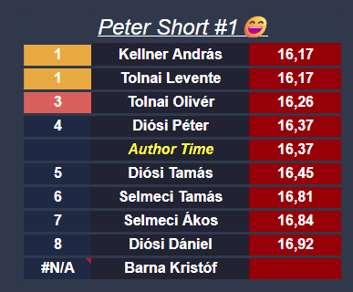Levente holtversenyben van a Peter Short #1 az első helyért, a Peter Short #4 pályán pedig a harmadik helyen. Ez utóbbin őket az author time, majd Selmeci Ákos követi. Ákos a többi pályán a 7. és 8. helyen van jelenleg. Barna Kristófnak még nincs érvényes bejegyzett ideje.