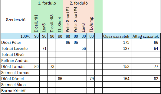A versenyzőknek négy pályán kellett a lehető legjobb eredményt elérni. Diósi Péter két mapja, a Peter Short #1 és a Peter Short #4 mellett Tolnai Levente Levi3 és Diósi Dániel TL-Jump trackje került be a fordulóba. Péter pályái lettek a legnépszerűbbek, mindkettő egyforma 86%-os elégedettségi mutatóval nyerte a kört, mögötte 79%-al a TL-Jump, majd mindössze 56%-al a Levi3 zárt. Ezzel a pályaépítők versenyét Diósi Péter vezeti, ámbár többeknek még nem került be versenybe az alkotásuk.