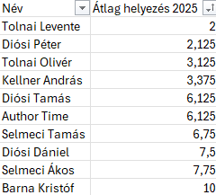A két forduló tekintve így néznek ki az átlagos helyezésszámok: