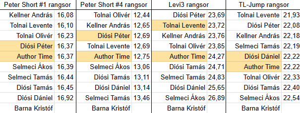 Ebből nagyon élesen kitűnnek a párharcok: Tolnai Levente vs. Diósi Péter ; Tolnai Olivér vs. Kellner András ; Diósi Tamás (aki az author timeok körül ólálkodik rendszerint) vs. Selmeci Tamás ; Diósi Dániel vs. Selmeci Ákos.