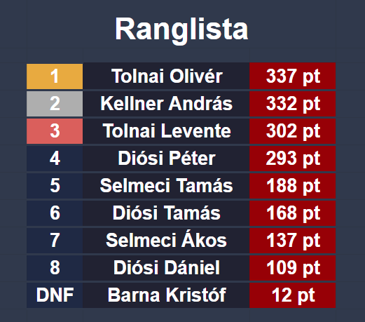 Olivér és András között mindössze 5 pont (!) lett a különbség, ami rendkívül szoros. A bajnoki címhez 337 pontra volt szükség, a második hely 332 ponttal zárt. A dobogó legalsó fokára 302 ponttal állt fel Levente, akihez Diósi Péter közel volt, a maga 293 pontjával.